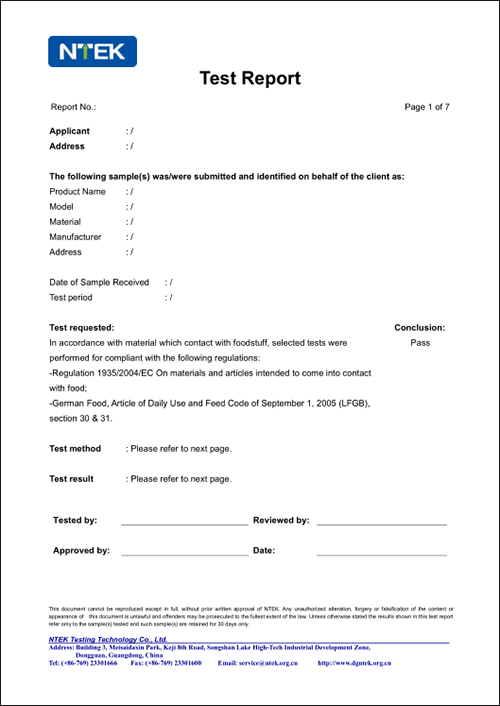 LFGB測試報告適用范圍