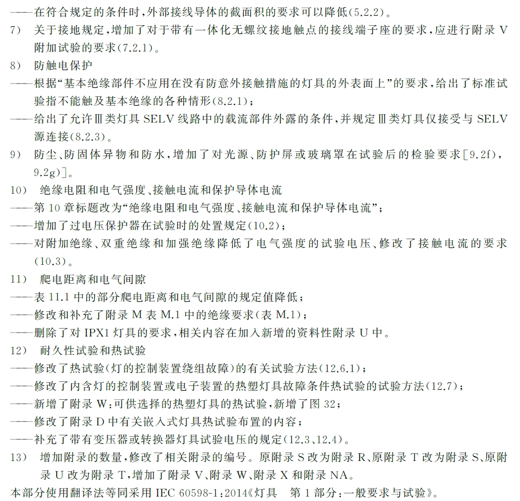 本次新標等同采用了IEC 60598-1:2014版,從IEC的第6版跳過了第7版,直接采用第8版。新標與舊標有不少變化,