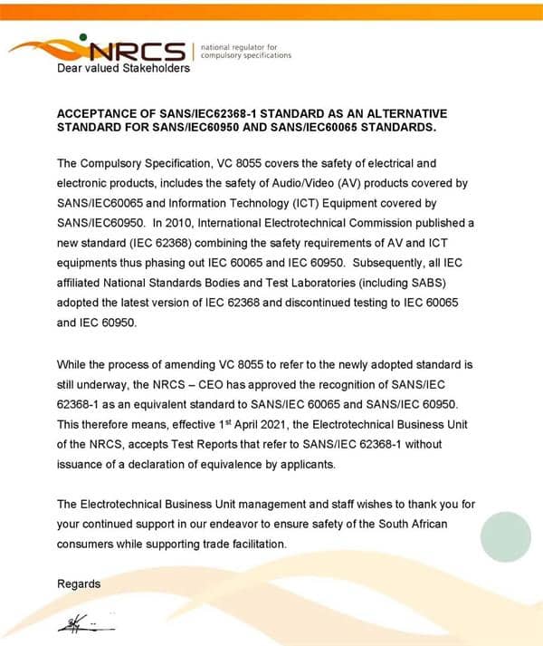因此,這意味著自2021年4月1日起,NRCS的電工技術業務部門將接受涉及SANS / IEC 62368-1的測試報告,而無需要求申請者提供等同聲明。