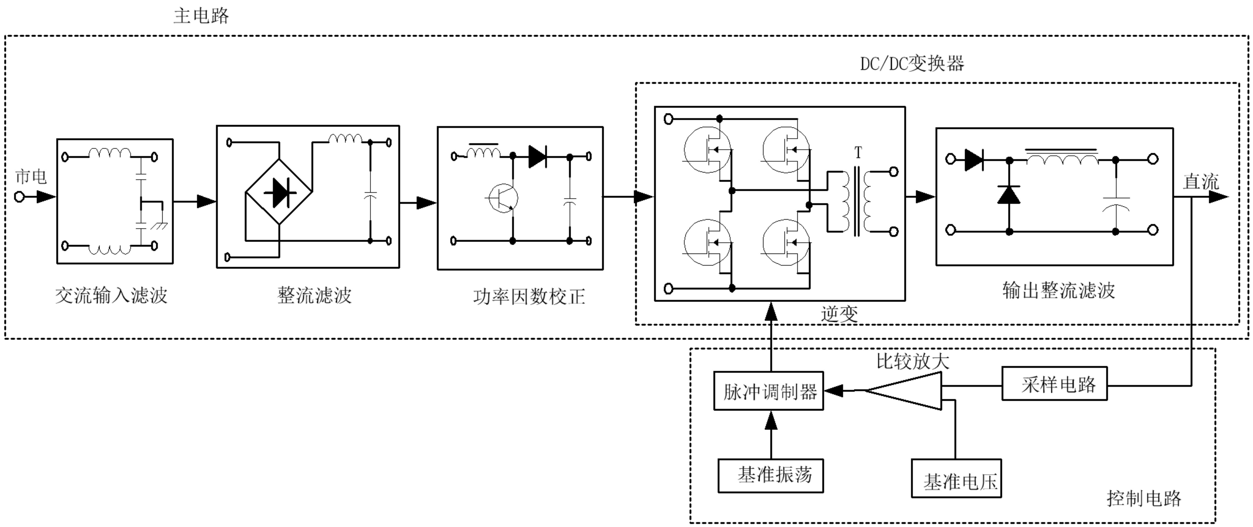 最常見的AC-DC電源的功能框圖如下圖所示,包含交流輸入濾波、整流濾波,功率因數校正、DC-DC變換器、控制電路等模塊,市場上的一些廉價電源,往往偷工減料,比如:把功率因數校正模塊和交流輸入濾波模塊刪減掉,輸出整流濾波模塊使用盡量少的輸出濾波電容,使用質量等級低的元器件,元器件降額余量不足等問題。這樣的電源買回去,不但有可能給用電設備的壽命造成影響,甚至有可能引發火災,導致嚴重后果。