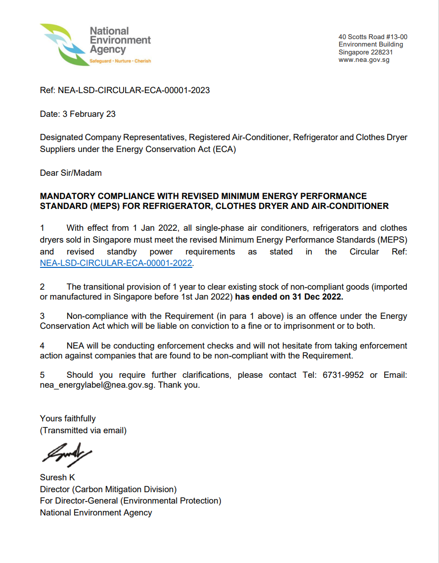 新加坡國家環境局(NEA)于2023年3月10日根據《節能法案》(ECA)發布了關于空調、冰箱和干衣機的新通知。