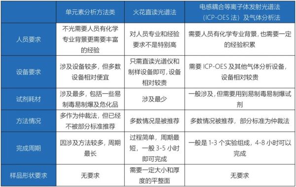 金屬成分分析的本質是元素含量的分析,關于元素含量的分析手段有很多,例如:化學分析法、原子/ICP光譜法、X射線能量色散譜法(EDX)、電子能譜分析法、X射線衍射法(XRD)、質譜法(MS)、分光光度計法、火花直讀光譜法、氣體分析法等。本文主要介紹成品金屬材料的推薦分析方法。