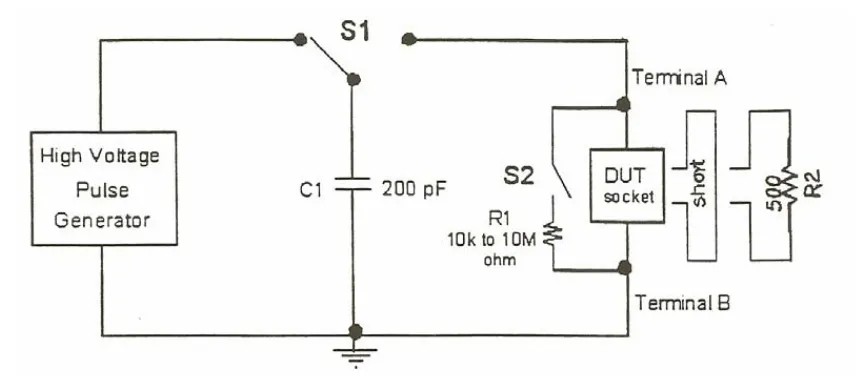 用于模擬帶電導體在電子元件上產生靜電放電。是指機器(例如機械手臂)本身積累了靜電,當此機器碰觸IC時,該靜電便經由IC的PIN腳放電。該放電過程持續時間較短、電流較大。由于機器多為金屬,金屬的阻抗可以認為是0Ω,所以機器放電模式中的等效電阻為0Ω,等效電容定為200pF,并且相比于HBM, 等效電路中多出了一個電感。