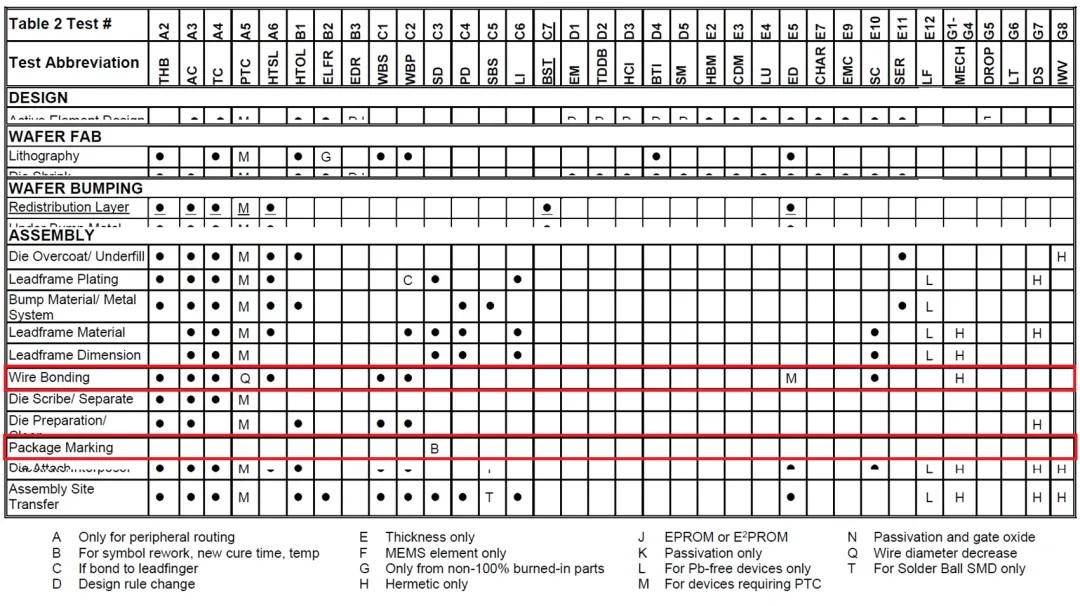 如果芯片的變更僅限于表面字符,那么僅需補測C組中的SD即可。對于其他類型的變更,以ASSEMBLY中Wire Bonding為例,則需要補測以下項目: