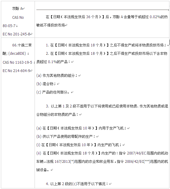 2016年5月4日,歐盟向WTO提交G/TBT/N/EU/375號通報,擬增加REACH法規附件XVII對十溴二苯醚(decaBDE)的限制條款,規定作為物質本身不得生產或投放市場,作為另一種物質的組分以及混合物或物品中的含量不得大于或等于0.1% 。