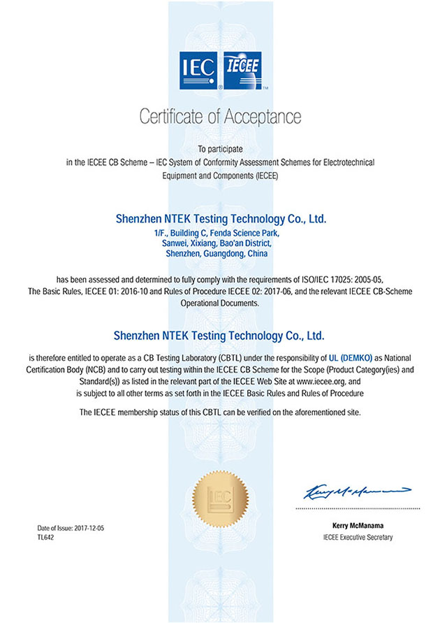 2017年12月5日,NTEK正式獲得國(guó)際電工委員會(huì)(IECEE)認(rèn)可,成為了目前少數(shù)擁有CBTL資質(zhì)的檢測(cè)認(rèn)證機(jī)構(gòu)。