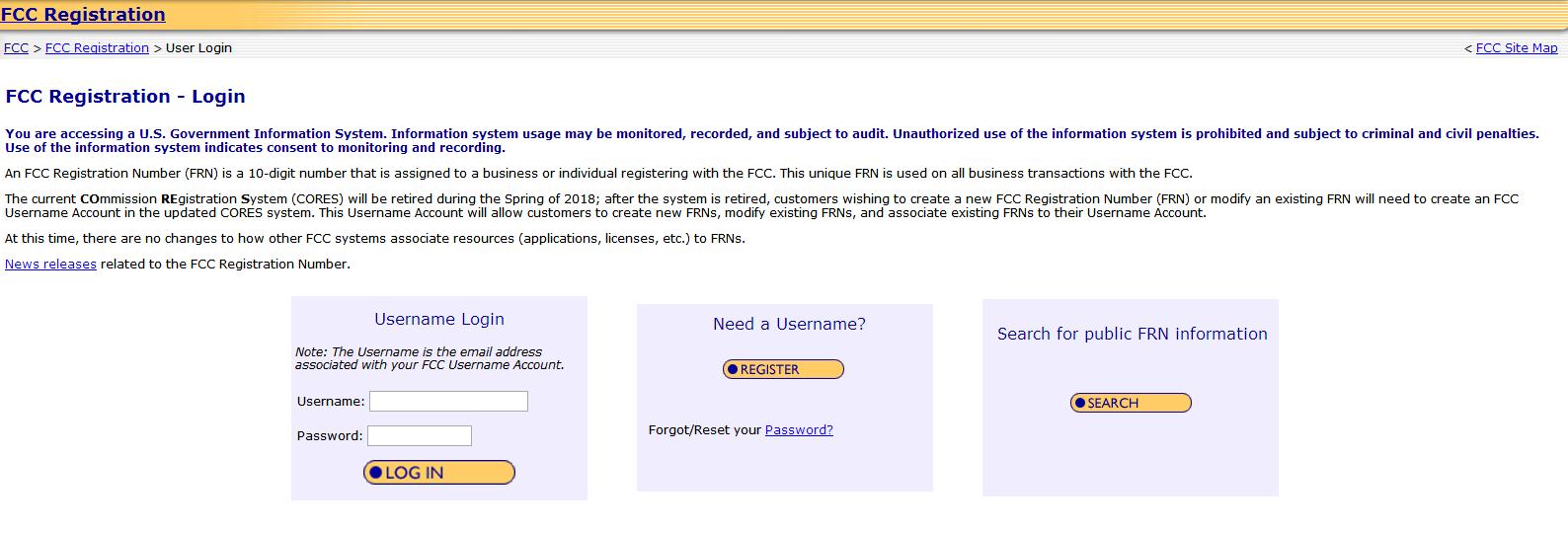 目前的CO mmission RE gistration S ystem (CORES )將在2018年春季退役; 系統(tǒng)退役后,希望創(chuàng)建新的FCC注冊(cè)號(hào)(FRN)或修改現(xiàn)有FRN的客戶需要在更新的CORES系統(tǒng)中創(chuàng)建FCC用戶名帳戶。此用戶名帳戶將允許客戶創(chuàng)建新FRN,修改現(xiàn)有FRN,并將現(xiàn)有FRN與其用戶名帳戶相關(guān)聯(lián)。