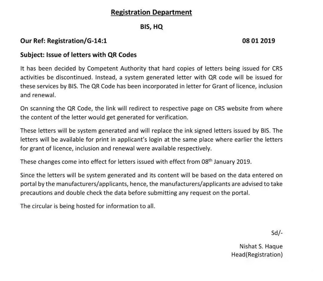 2019年1月8日,印度BIS發出公告,通知BIS將停止簽發紙檔證書,原先需經由BIS官員簽字的紙質證書,變更為系統生成的帶二維碼的證書。掃描二維碼后,該鏈接將轉到BIS網站上的相應頁面。通過掃描二維碼,即可查詢產品的真偽信息,對證書內容進行核對和驗證。