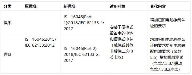 更新的標準最遲生效日期為2020年3月14日,IS 16046:2015/IEC 62133:2012將會被完全取代。