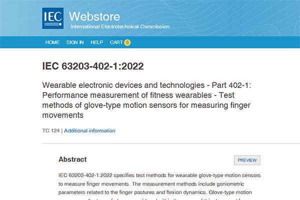 2022年11月4日,國際電工委員會(IEC)發布IEC 63203-402-1:2022《可穿戴電子設備和技術--第402-1部分:健身穿戴設備的性能測量--用于測量手指運動的手套式運動傳感器的測試方法》。