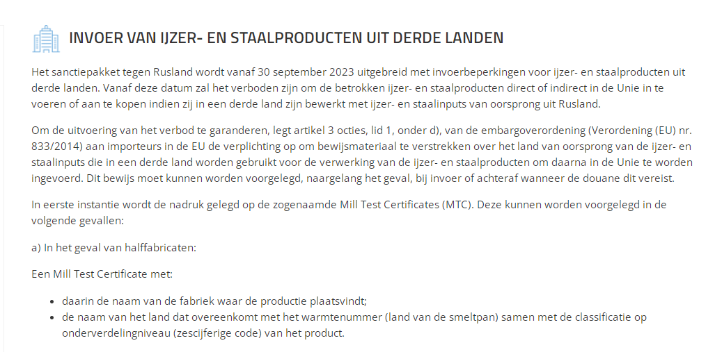 為確保禁令的實施,禁運條例規定歐盟進口商有義務提供有關鋼鐵產品原產地的證據,該證明必須在材料進口時出示或根據海關要求出示:即如果客戶產品中含有鐵、金屬或類似材料,所提供的預報資料中還需附有MTC材質質量證書 (mill test certificate),所涉及的HS CODE 為72-83開頭的海關編碼。