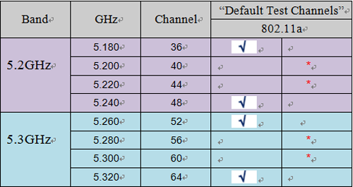 測試5G WiFi時要對其測試信道進行選擇,以下802.11a模式下5.2G跟5.3G測試信道: